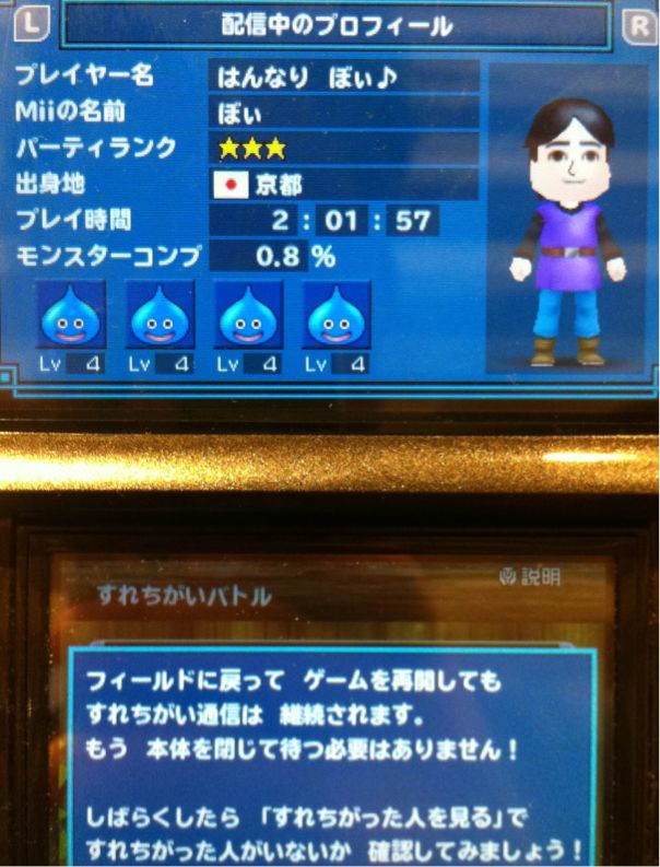 プレイ中でもすれ違えるし、3DSの特徴である、別のゲームをやっていても、すれ違いが出来ますしね。