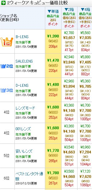 そこで、価格比較なんですが、コンタクトレンズ通販比較.com と言うところで見て、最安値ショップで買ったんですが、もうちょっとよく見るべきでした。