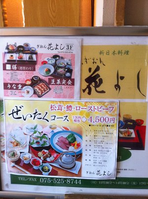 お墓参りの後は、きまってお食事をするんですが、場所をいつも、両親が決めてくれ、それがけっこう楽しみで、今年は、八坂神社のそばにある、「ぎおん 花よし」というところでの、 コース料理でした。