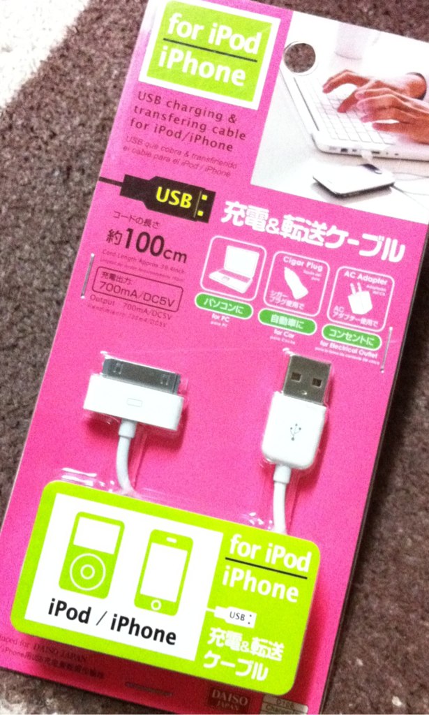 以前に、3DS用の充電ケーブルをダイソーで買って、お得感を感じてたんですが、今回は、iPhone用ケーブルを狩っちゃいました。