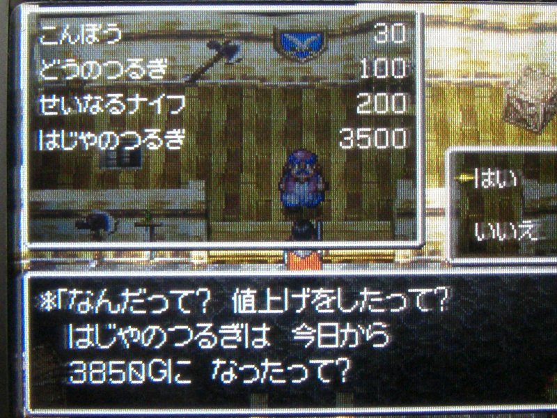 で、そうこうしてると、なんと、はじゃのつるぎ を売りに来た客がいて、買い取ったんですが、3500Gで、店頭に並びました。買い取り価格は、2600Gぐらいだったんですが、なかなか良い商売してますねぇ。