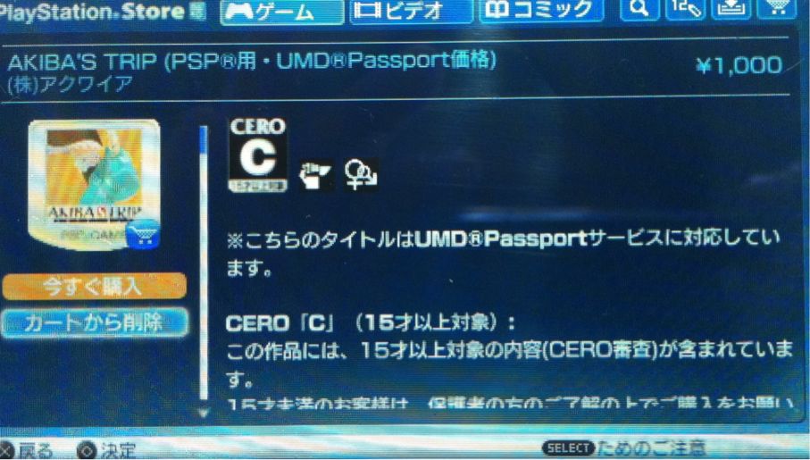5.実際にPSストアに接続して、登録したタイトルの詳細(購入)画面まで行くと、UMD Passport 価格として、¥1000 にて購入することが出来ました。