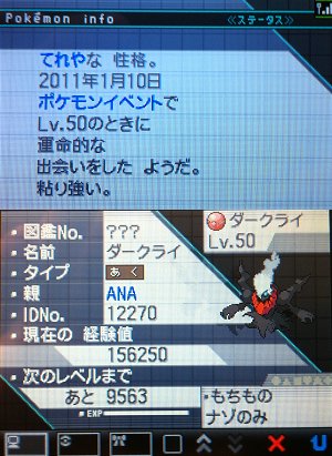 僕はホワイトなんですが、子供がブラックで、このイベントで、ダークライもらえるから、ゲームカートリッジもって行くで? 10日間、ポケモンできひんけどええか? というも、二つ返事でOK。お願いしますとのこと(笑